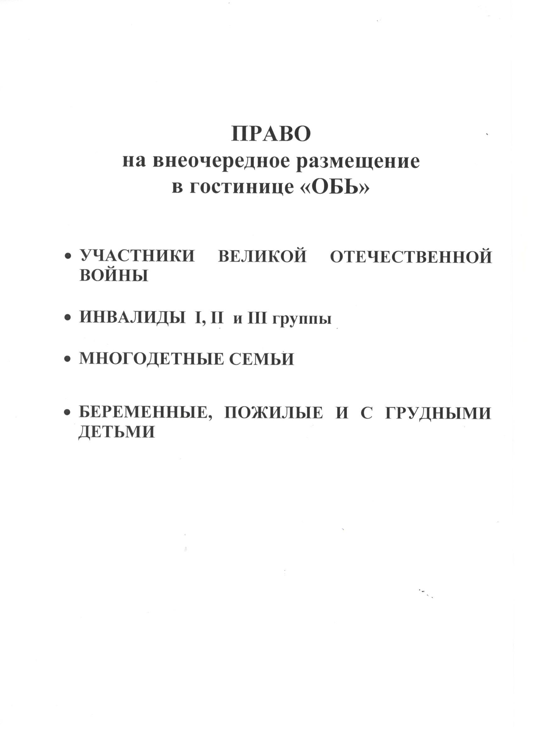 Внеочередное размещение в гостинице ОБЬ |