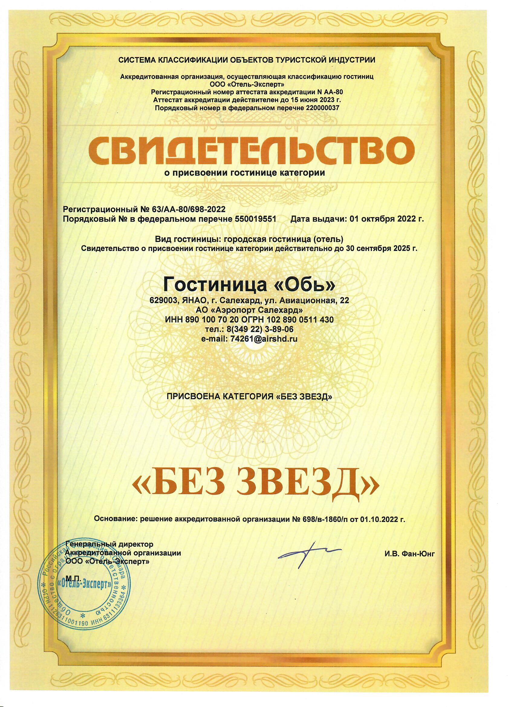Свидетельство о присвоении категории БЕЗ ЗВЕЗД |